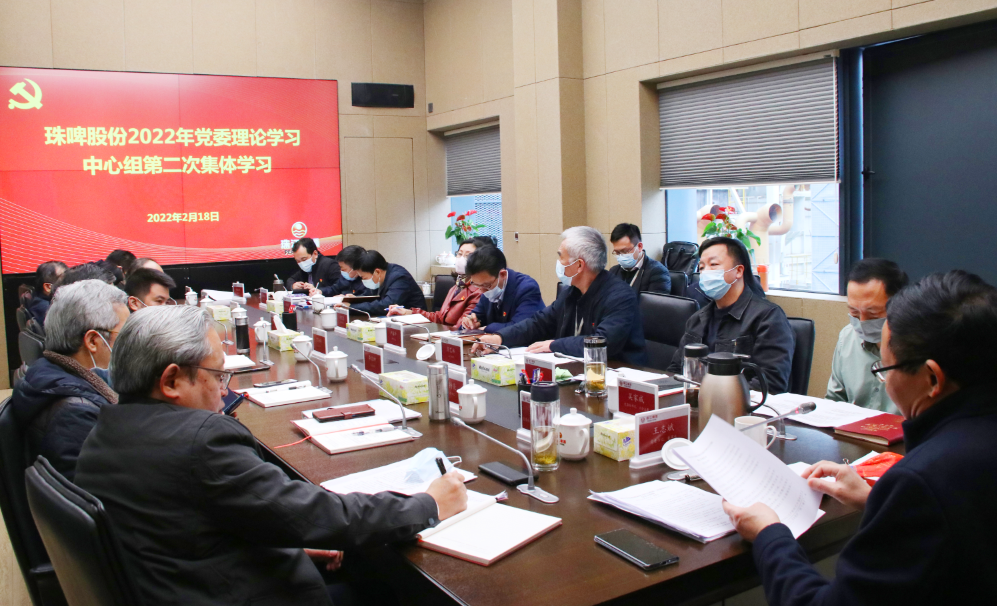 2022年2月18日,珠啤股份党委理论学习中心组召开会议,开展习近平生态文明思想专题学习研讨,珠啤股份党委书记、董事长王志斌主持会议,党委理论学习中心组(扩大)成员、党委及纪委职能部门负责人参加会议。